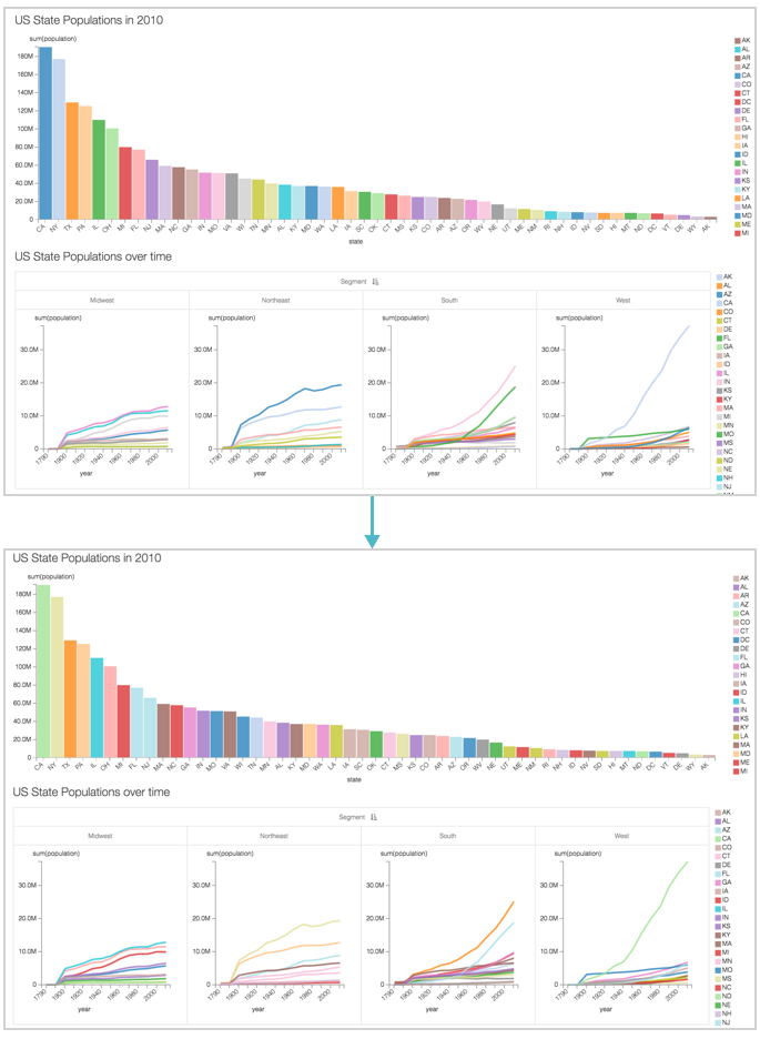 In the following example, we show how to standardize colors for a US State Population dashboard that uses a bar visual and a trellised line visual.