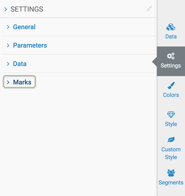 Customizing marks Several display options may be managed from the Marks menu, depending on the chart type in the visual. To get to the options in the Marks menu, follow these steps: On the right side of the Visual Designer, click the Settings menu. In the Settings menu, click Marks. The Marks interface has the following options: Displaying tooltipsShowing detail data button in context menuShowing the context menuShowing table data as HTMLShowing adjacent duplicate valuesShowing expansion totals above expansion rowsDisplaying title for subtotal rowsAdding and removing legendChanging legend item widthChanging legend widthReversing legend orderDisplaying a linear trendline Separating trendlines by colorChanging trendline number of decimals.Showing a selection brush for rangesChanging bar size rangeShowing measure values inside barsShowing dimension values on hoveringShowing pointsIgnoring missing date valuesChanging line shapeChanging line styleChanging highlight typeConverting line to area visualChanging highlight of radiusChanging mark size rangeChanging transition delayShowing autoplay transition animationShowing dimensions as marksShowing percentages as marksChanging number of decimalsChanging display to overlapShowing the same source and destination valuesChanging size of chord visualDisplaying bubbles on mapsChanging layout gravityChanging layout thetaShowing node labelsTokenizing inputDisplaying gauge needleDisplaying gauge line on qualitative arcDisplaying axis ticksChanging outer widthChanging qualitative thicknessChanging arc gapChanging arc thicknessChanging label font sizeChanging label offsetChanging sublabel font sizeChanging sublabel offsetMaking box plots horizontalChanging outline widthChanging font size of main indicatorChanging value of main indicatorUsing same color for main indicator as arrowDisplaying first measure as main indicatorChanging compare indicator valueChanging compare indicator positionChanging arrow typeFlipping compare indicatorChanging label indicator positionChanging label indicator font sizeIgnoring negative valuesChanging approximate tick countOrienting bars verticallyRemoving default labelStaying at same map locationSetting minimum cell sizeParent topic: Customizing visual settings