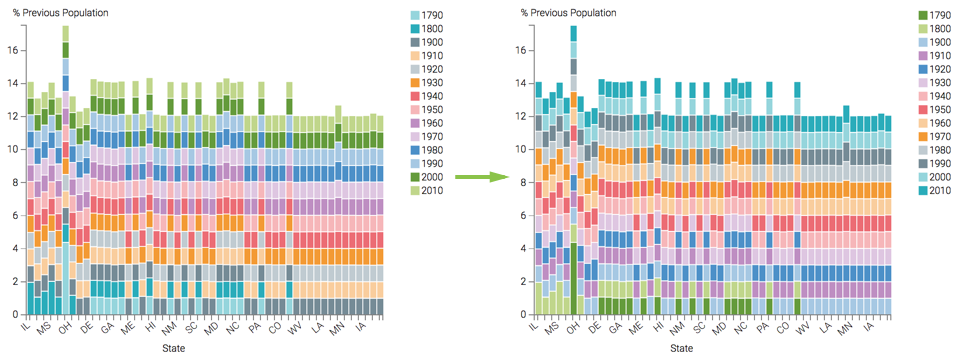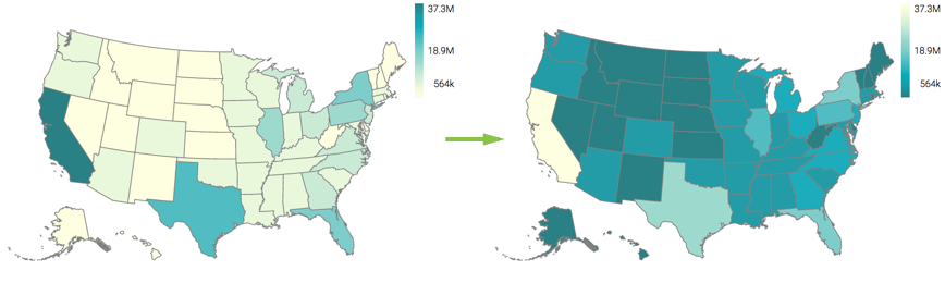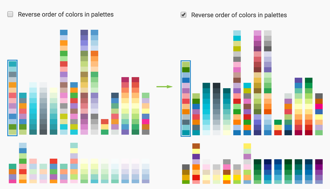 Enabling reverse color palette of visuals CDP Data Visualization enables you to reverse the color palette in your visualizations. To reverse the color palette in your visualization, select Reverse order of colors palettes. Note that the colors in the visual flip; the legend is a good indicator of this. The color reverse effect is particularly noticeable on monochromatic and dichromatic color palettes, which typically use a gradient legend. Parent topic: Customizing visual colors