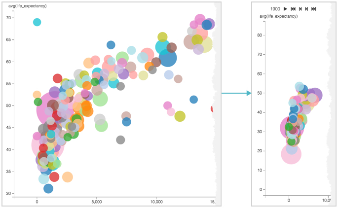 Placing a periodic dimension on the Transition shelf of a scatter visual enables you to animate a scatter visual. This is very useful when dimensions represent dates and times. This task applies to Scatter visuals.