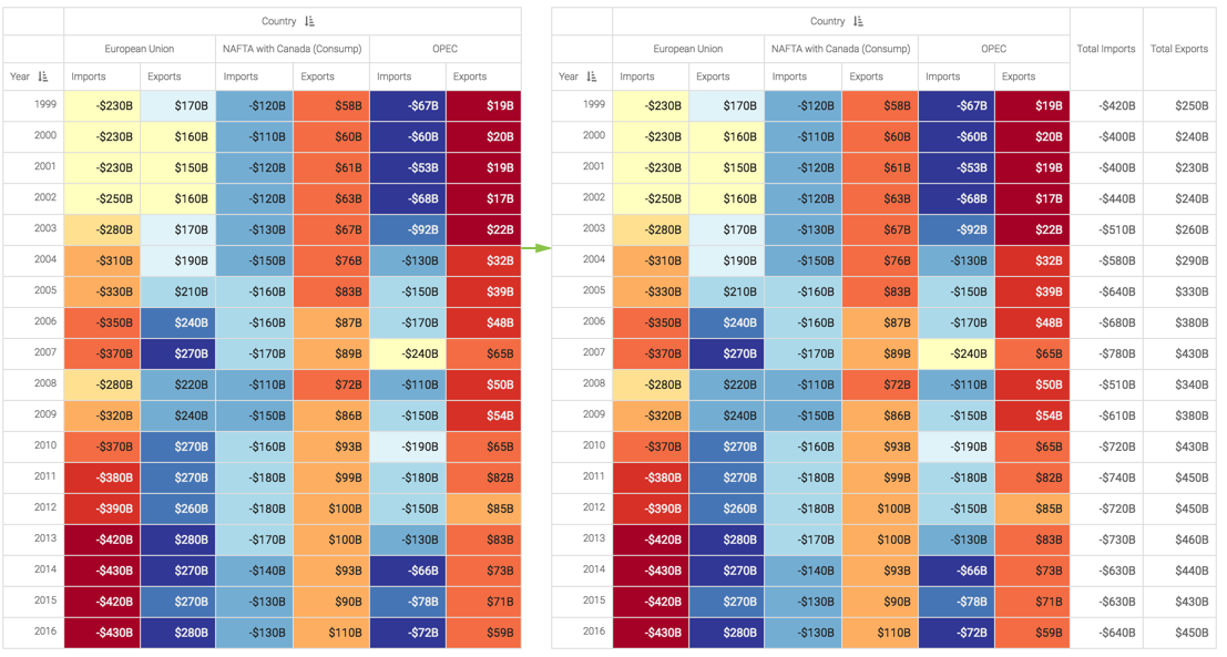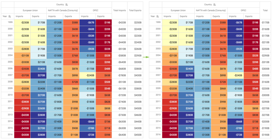 In this example, you can see a visual with uncombined totals of the Import and Export columns, and another visual that combines them to show the actual trade deficit.