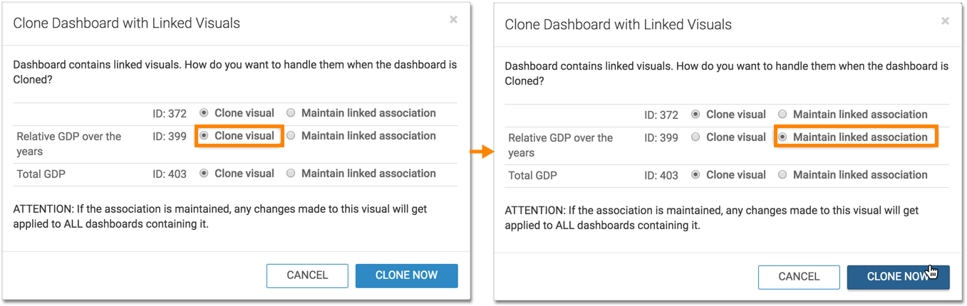 If the dashboard contains linked visuals, the Clone Dashboard with Linked