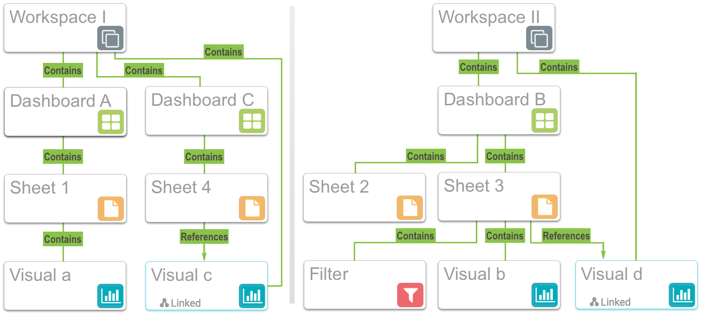 Cloning linked visuals You can clone the linked Visual c. This creates a new Visual d in Workspace II. The new Visual d is also linked. Dashboard C in Workspace I remains unchanged: Visual c is still there, and it is still a linked visual. Parent topic: Moving a dashboard