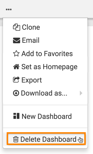 Deleting a dashboard CDP Data Visualization makes it very simple to remove dashboards that you no longer use. Find the dashboard you want to delete. Open it either in Edit or View mode. Click the (supplemental) menu in the top menu bar and select Delete Dashboard. The delete confirmation modal window appears. Click DELETE to confirm deleting this dashboard.