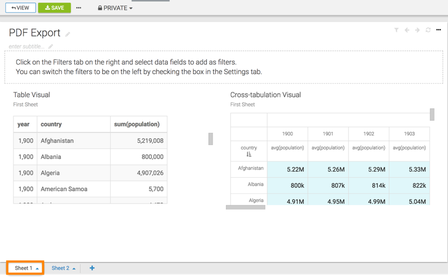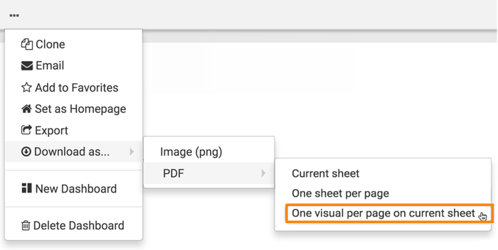 file with each visual of the current sheet on a separate page.Before you download the dashboard as a PDF file, make sure that