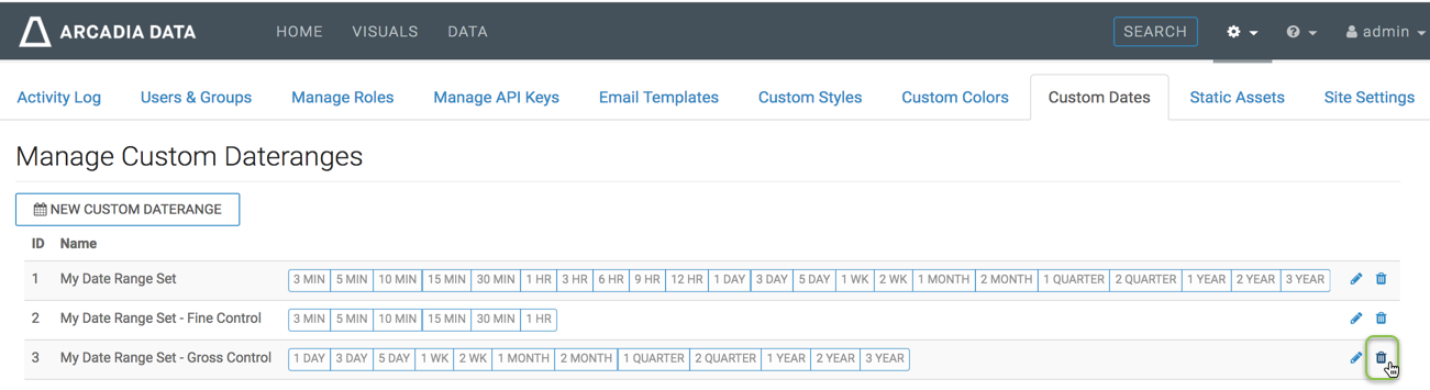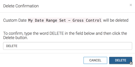 Deleting custom date ranges To delete set of custom date ranges, follow these steps: In the Manage Custom Dateranges interface, click Trashcan icon next to the set of date ranges to delete. We are deleting My Date Range Set - Gross Control. In the Delete Confirmation window modal, type DELETE, and then click the Delete button. In the Manage Custom Dateranges interface, notice that the list no longer has the deleted set.