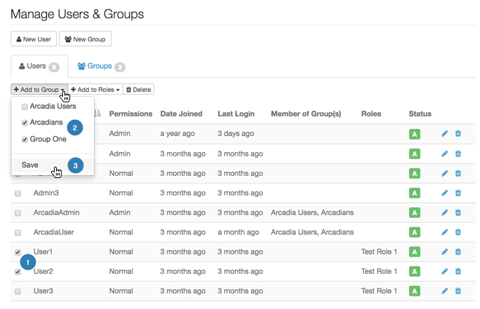 Adding multiple users to multiple groups; users tab When working in the Users tab, you can add multiple users to one or more user groups: Select the users that you want to assign to groups. We used User1 and User2. Click the Down Arrow on the right of Add to Group, and select the groups for the users. We used Arcadians and Group 1. Click Save. Parent topic: Adding users to user groups