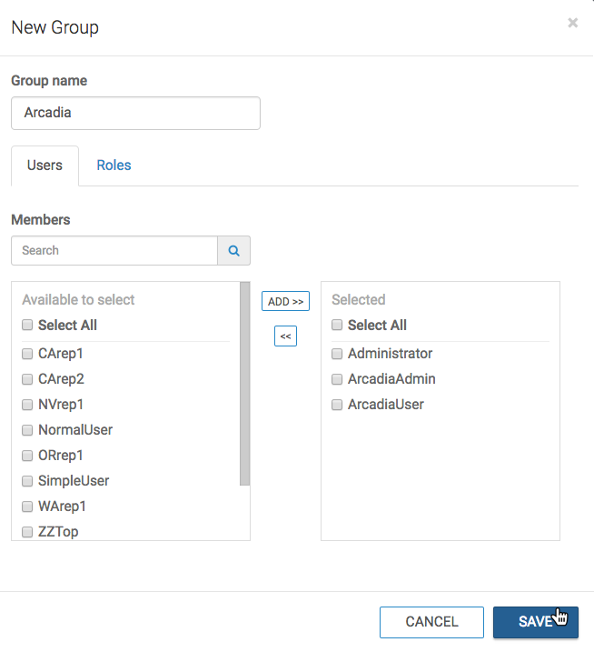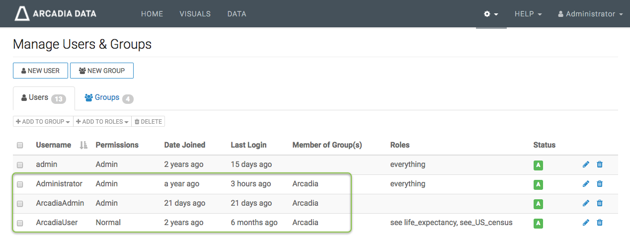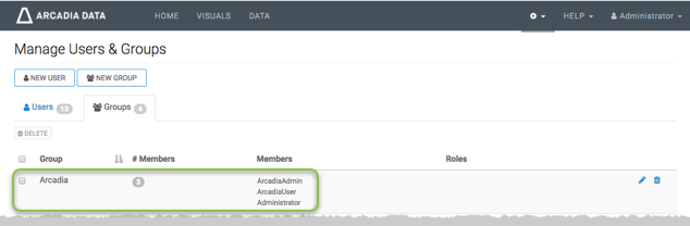 part of the list, and lists its three (3) members (ArcadiaUser,