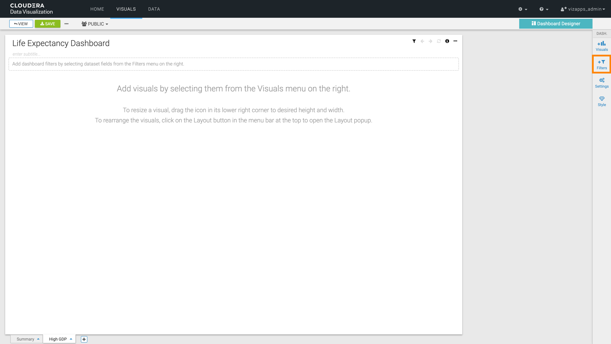 - Choose a sheet in the dashboard where you plan to add visuals.In this example, a sheet called High GDP is used.
