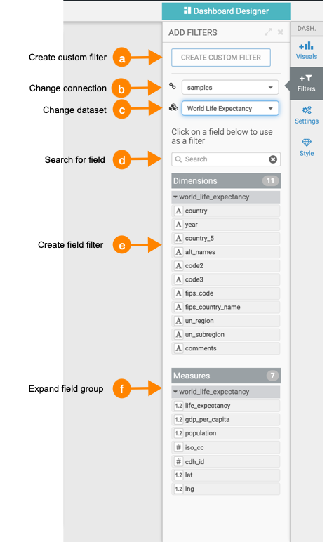 Clicking one of the fields in either Dimensions or Measures adds a basic filter based on that field into the filter area of the interface.