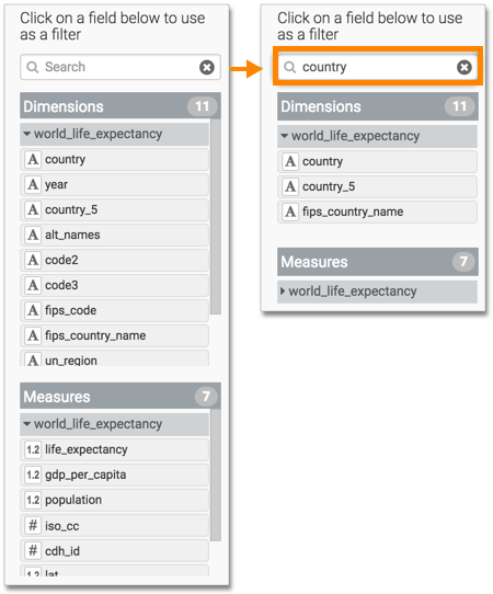 For datasets built on very wide tables, this option helps you find the base field for your filter.