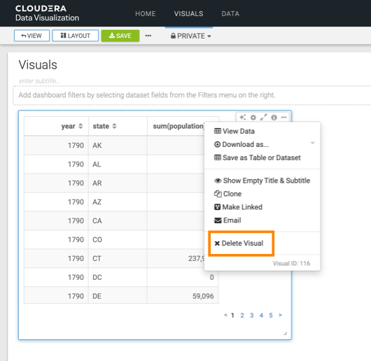 These instructions show you how you can delete a visual in CDP Data Visualization. When you remove an unlinked visual from the dashboard, you should use the 'delete...' menu option. After deletion, the visual no longer exists in the system.
