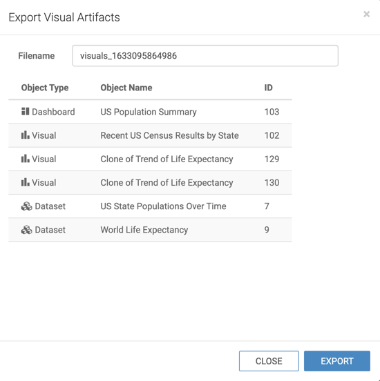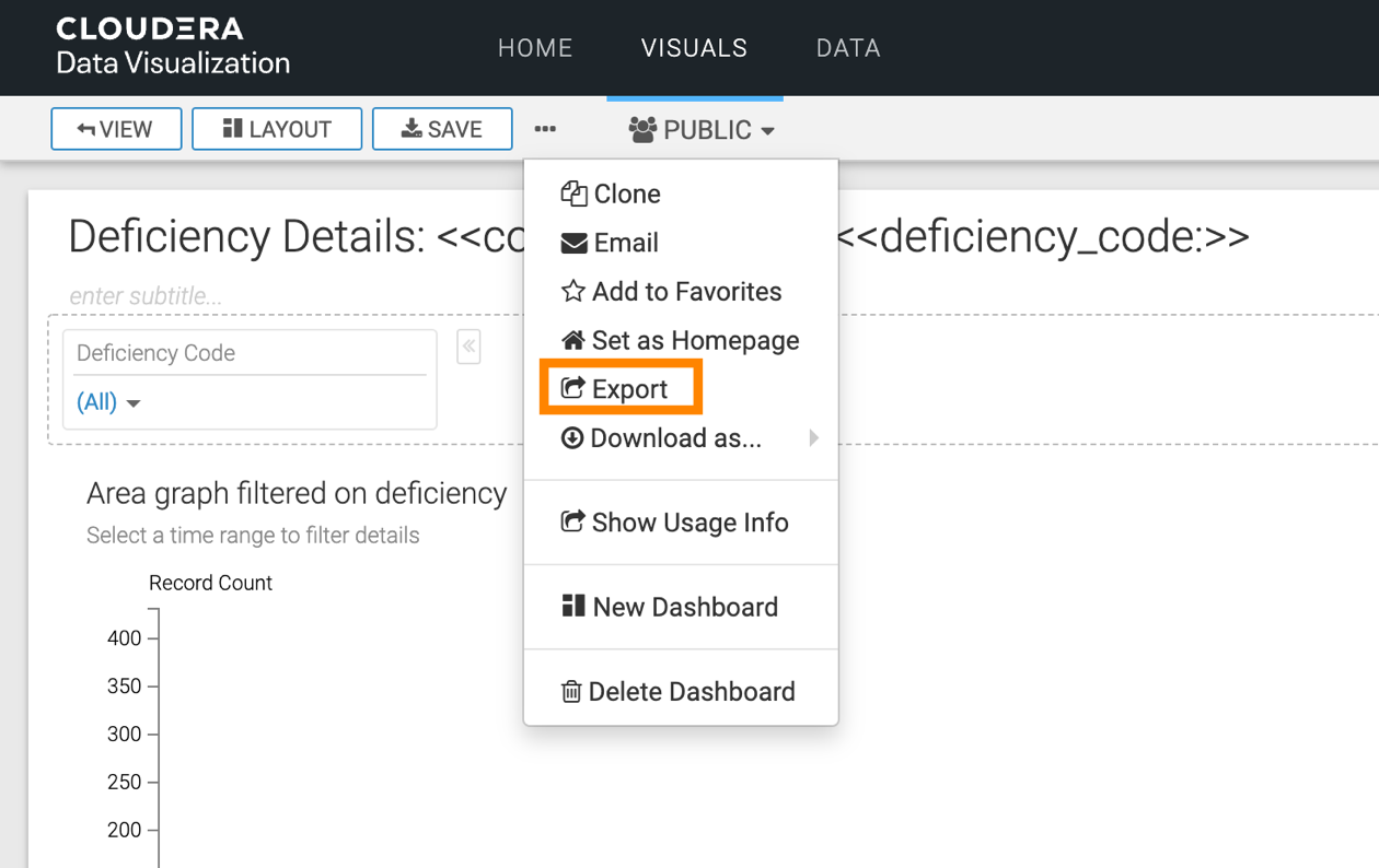 In CDP Data Visualization, you can export selected visuals. The export process captures all the dependencies, such as datasets and custom styles.