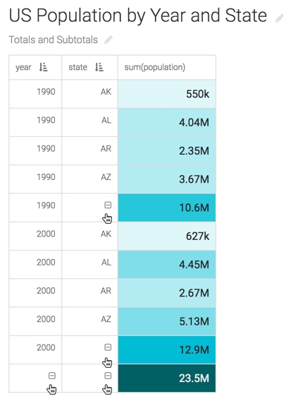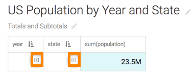 Hiding data and subtotal rows To hide the expanded rows and subtotals, follow these steps. Click the - (minus) icon in the year and state columns. The expanded rows and subtotals no longer appear in the visual. Note that a (plus) icon appears again in the year and state columns. Parent topic: Displaying totals with data expansion