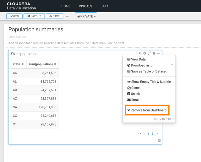 CDP Data Visualization enables you to remove a linked visual from a dahsboard in case you do not need it any more.