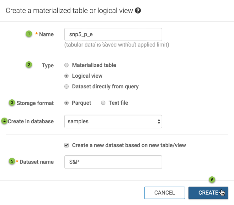 - Optional: When creating a dataset as part of this operation, select the Create a new dataset based on new table/view option, and enter the Dataset name.