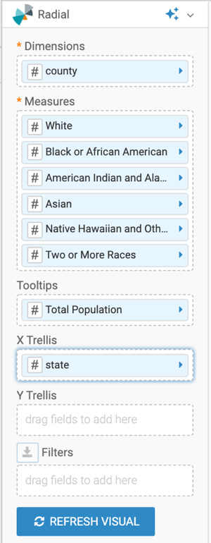 In Radial visuals, CDP Data Visualization enables you to add trellises for comparing and contrasting data.