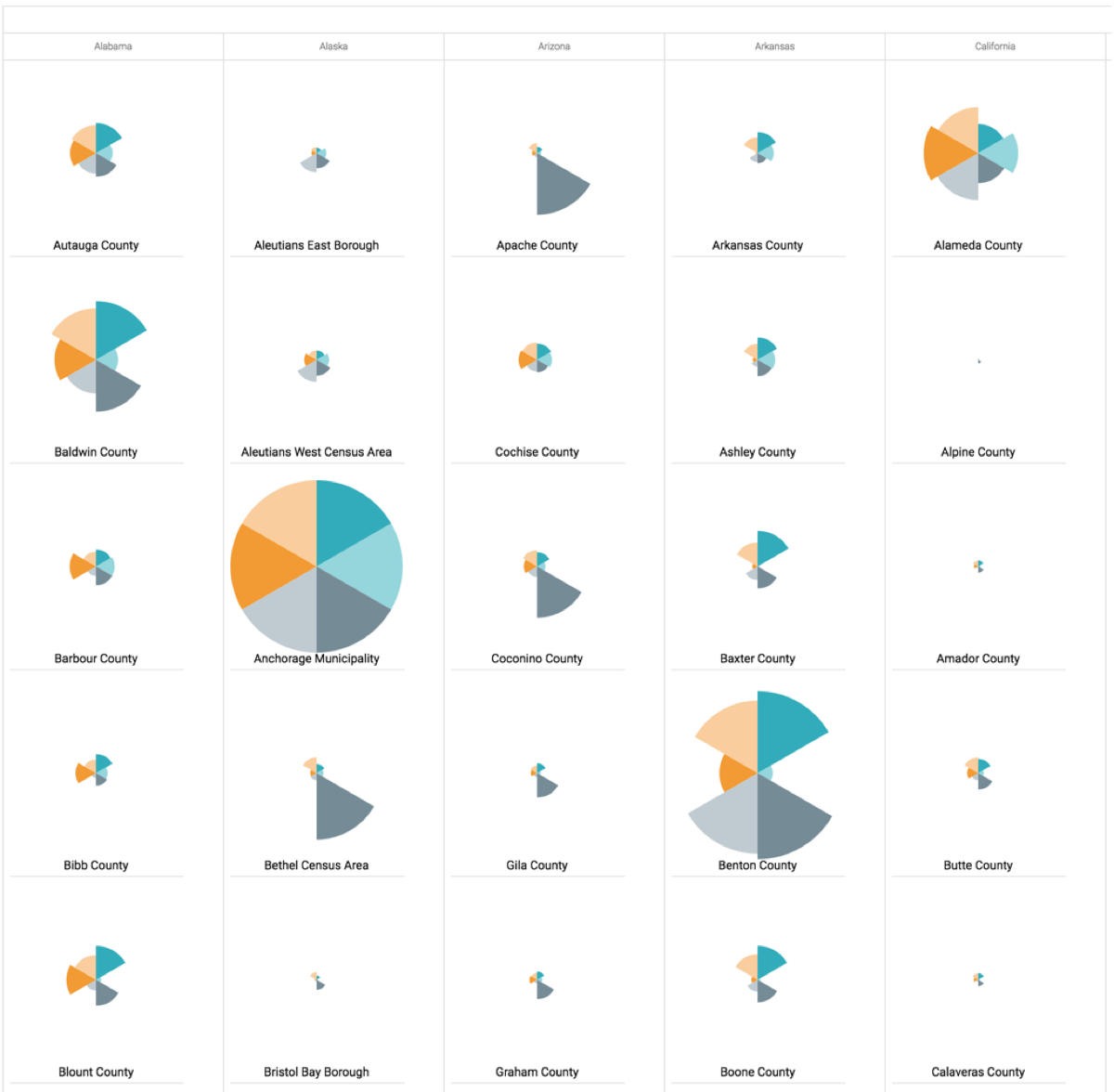 The trellising organizes the individual radial charts into columns, by State. Within each column, the charts appear by alphabetical name of the County.