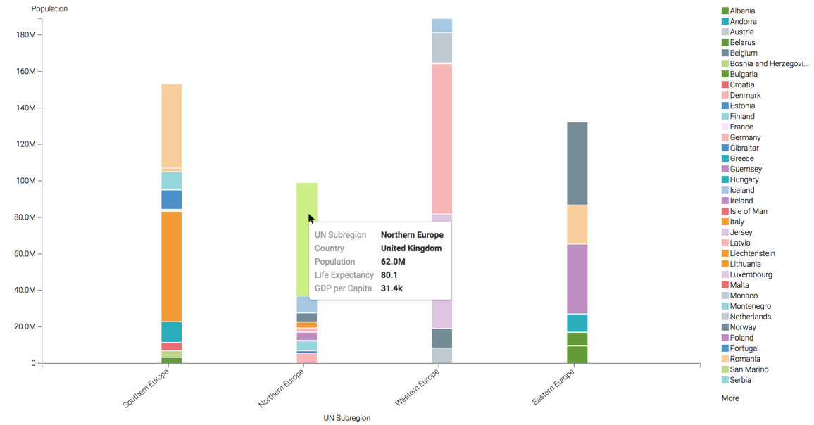 To develop a stacked bar representation of European population,divided by its subregions, follow these steps.