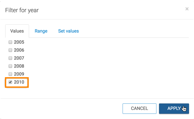 When working with a very large set of data, it is necessary to quickly access and examine a specific subset of information. CDP Data Visualization gives you the ability to filter information on all fields of the dataset.