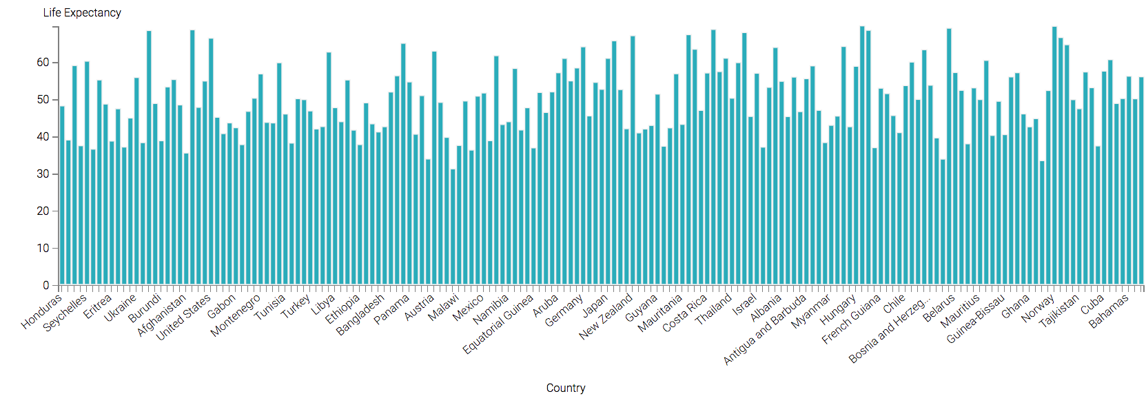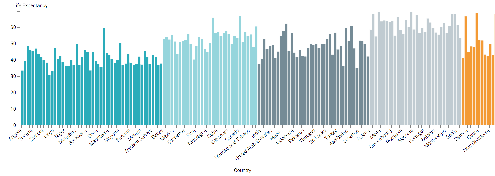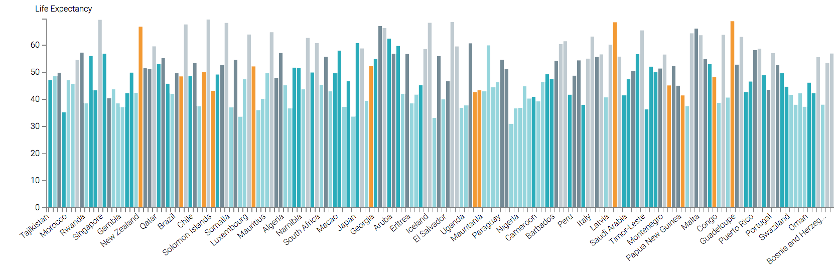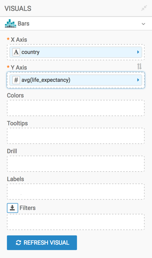 The following steps demonstrate how to create a new Bars visual on the World Life Expectancy dataset.