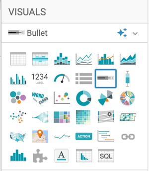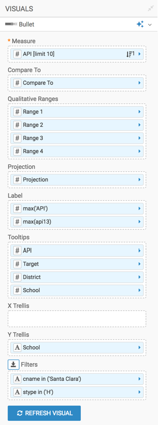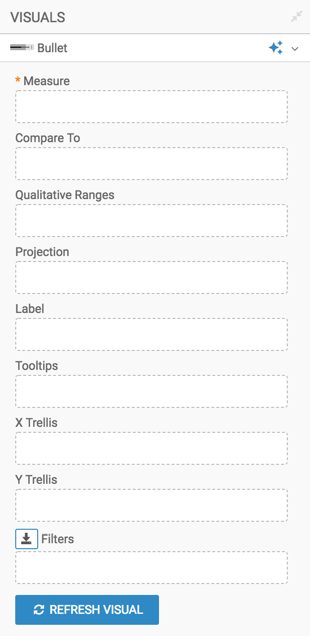 Just as other CDP Data Visualization visuals, the Bullet visual may be trellised using X and Y shelves, have additional fields on the Tooltips shelf, and you can use Filters with it. It also includes additional setting adjustments. For more information, see Shelves for bullet visuals.