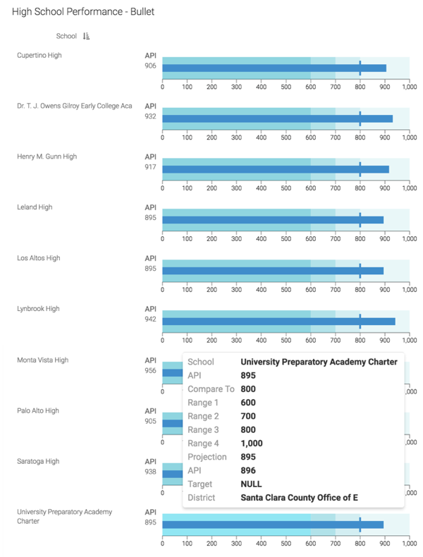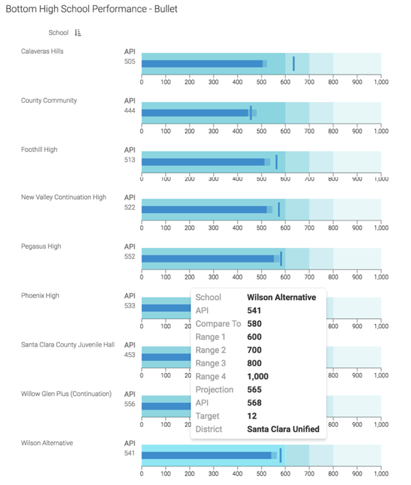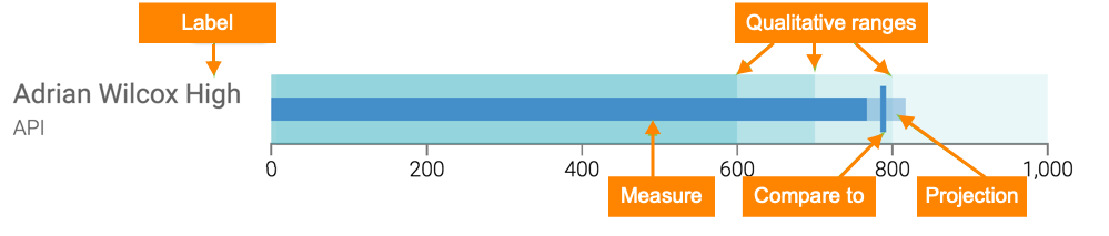 This is an example of a Bullet visual for a high schools. It illustrates the various elements of the bullet chart.
