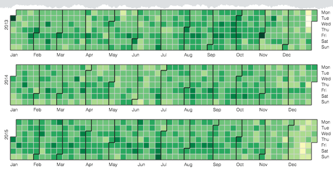CDP Data Visualization enables you to create Calendar Heatmap visuals. A Calendar Heatmap uses colored cells, typically in a monochromatic scale, to show relative number of events for each day in a calendar view. Days are arranged into columns by week and grouped by month and years. This enables you to quickly identify daily and weekly patterns, and to recognize anomalies.