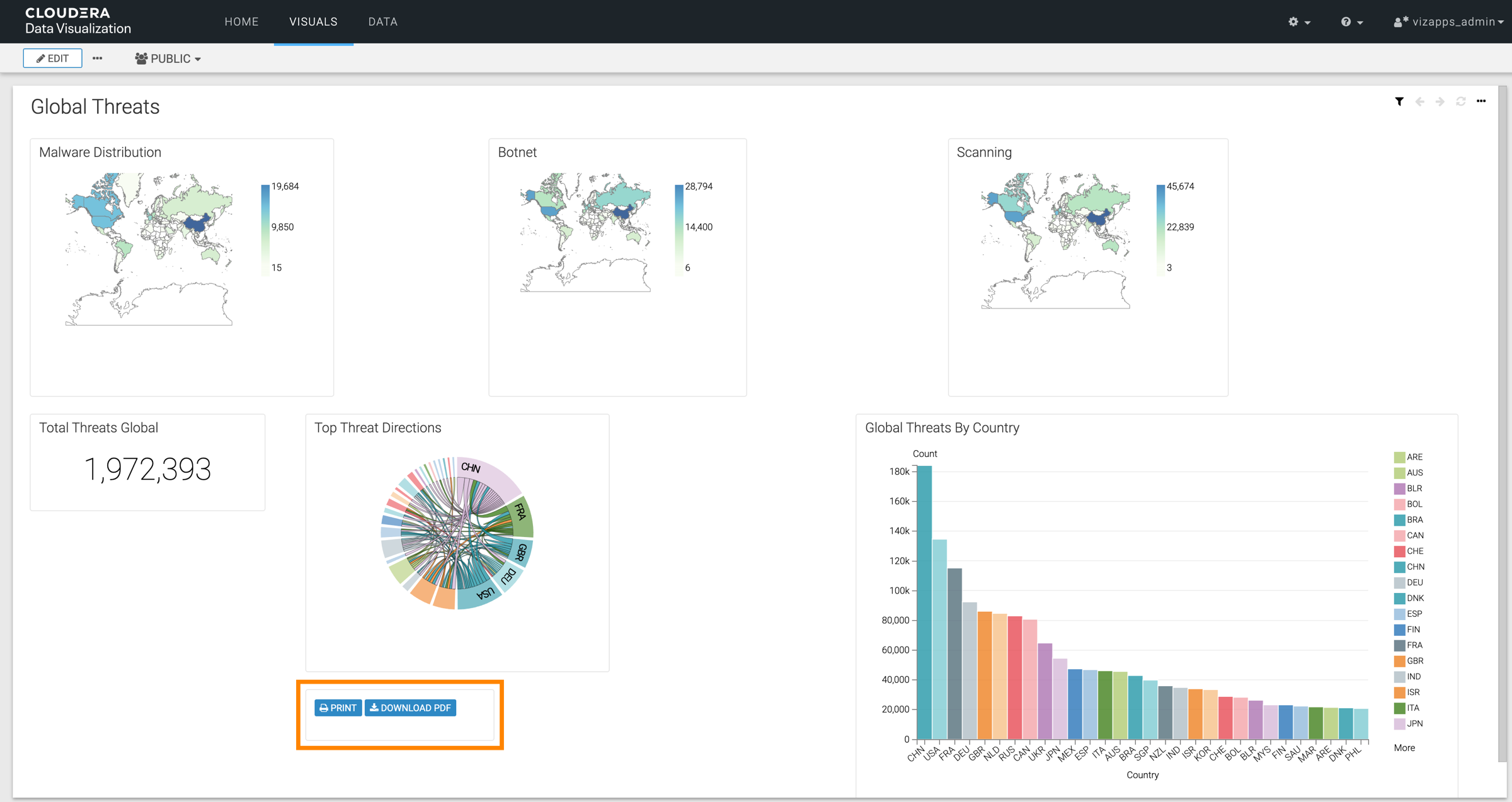 In the following examples, the definitions for Print dashboard and Download dashboard as PDF show how to perform these actions through an Extension visual. They have been implemented together, creating a visual that serves as an action panel within the dashboard.