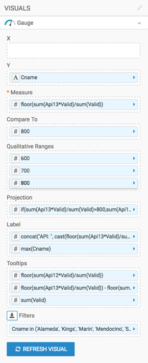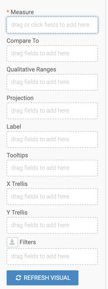 Like other CDP Data Visualization visuals, the Gauge visual may be trellised using X and Y shelves, have additional fields on the Tooltips shelf, and use Filters. For more information, see Shelves for gauge visuals.