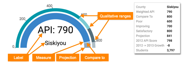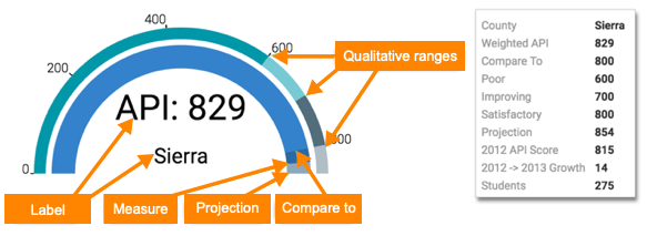 - In Example 3, Projection again appears in darker grey, but this time as an extension beyond the darker blue arc that shows by how much the Measure exceeds the lower Compare To value.