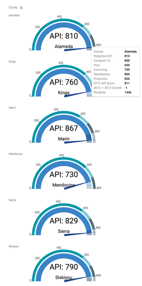 We are working with the District Performance dataset, built on a datafile that contains the California School District APIs from 2012 and 2013. The range of possible scores varies from a low of 200 to a high of 1000. However, the statewide API performance target is 800.