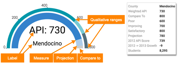 - The long dark inner arc of the visual represents the value on the Measure shelf. It is the feature measurement of the visual. In Example 3, the last section appears in dark blue because the value of Measure is greater than the Compare To value.