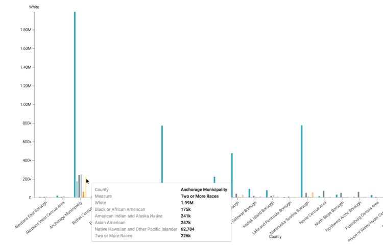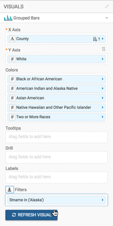 The following steps demonstrate how to create a Grouped Bars visual representation of ethnic distribution of population in some US counties. The example is based on the US Counties dataset . For more information, see Adding data and Creating a dataset.