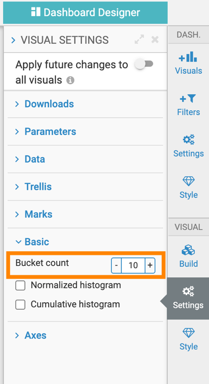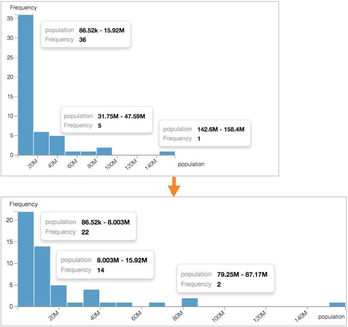 The following image contrasts the appearance of a histogram with 10 buckets and a histogram with 20 buckets. Notice that as the number of buckets doubles, the range of values covered by each bucket is reduced by half.