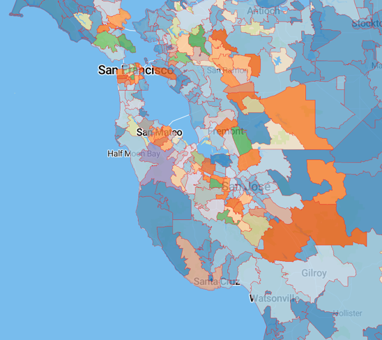 In this example, you will create a choropleth map that colors the average tax liability in California by zip code. The choropleth Interactive Map visual is based on the Personal Income Tax Statistics by Zip Code dataset. For an overview of shelves that specify this visual, see Shelves for interactive maps.