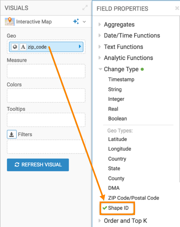 - Geo-type as Shape ID: The dataset must have at least one field in the Geo shelf to determine the location on the map. You must change the Geo-type to Shape ID. A Shape ID is a key that joins the shapes in the Custom mapbox style and the field in the Data Visualization dataset. This helps in identifying the measure that maps to the shape. This Geo field must be in the dataset that was used to create the custom mapbox style.
