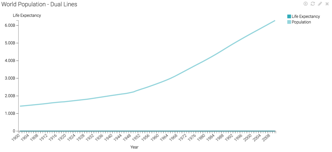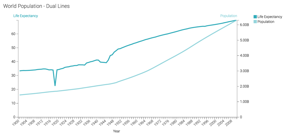 The following steps demonstrate how to create a Lines visual that uses a double axis. The example is based on the World Life Expectancy dataset.