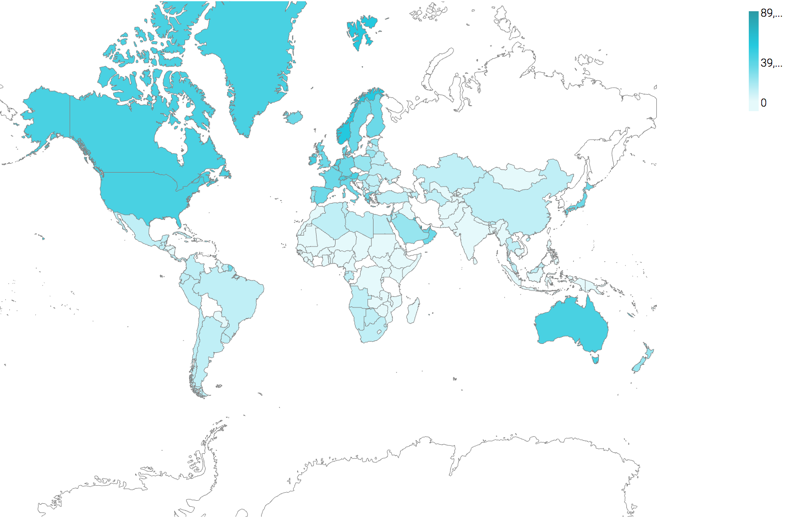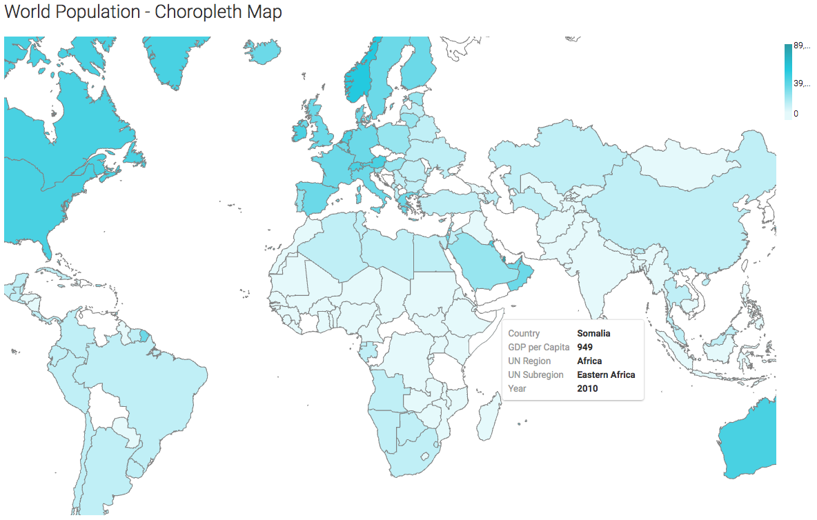 Map visuals can show relative measurement values for countries as colored areas. A world map can be used to show a comparison of measurement values among countries. With data that meets ratio and statistical continuity guidelines, a choropleth map is a good chart choice.