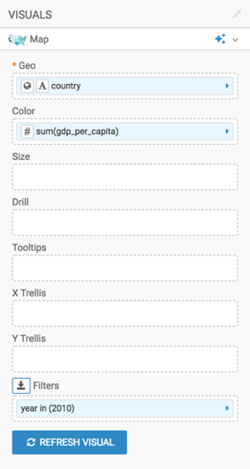 The following steps demonstrate how to create a new map visual on the dataset World Life