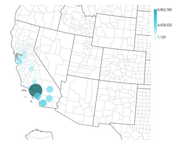 map with bubble marks that correspond to the total population of each county.