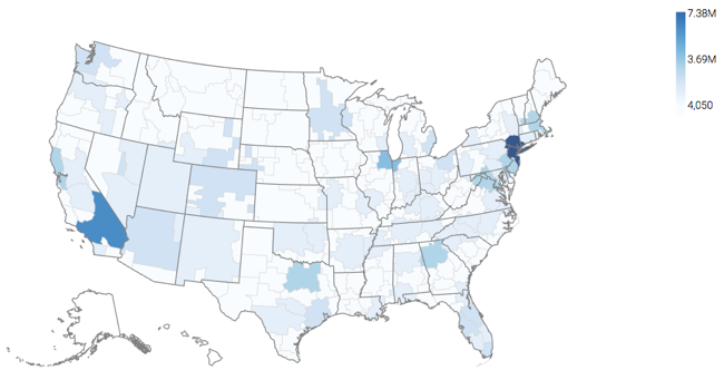 In CDP Data Visualization Map visual, you can visualize measurements on a map of DMA regions. A DMA map shows various measurements plotted relative to Nielsen Designated Market Area Regions.
