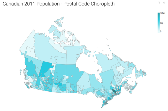 CDP Data Visualization Map visuals support choropleth mapping of measurements over a map of Canadian FSA and Postal Codes.