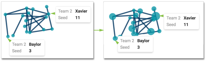 By default, the nodes of a Network visual have the same size. This visual has two data shelves, Source node size and Target node size, that produce a chart with nodes that represent values in the dataset.