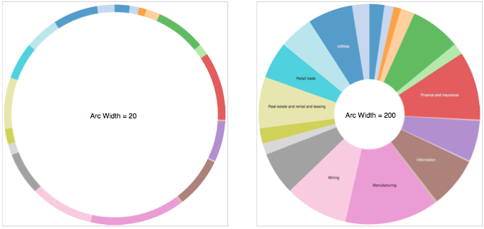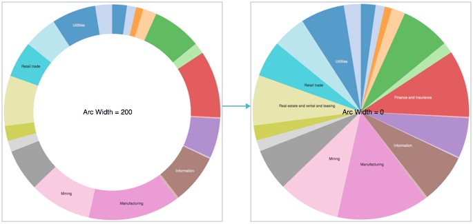 Pie charts are circular statistical graphics that show numerical proportion through relative size of slices; the arc length of each slice is proportional to the quantity it represents. In CDP Data Visualization, pie charts use a default 'doughnut' representation. However, you can change them to the more traditional closed pie configuration by controlling the arc width of the circle, as described in Changing arc width.