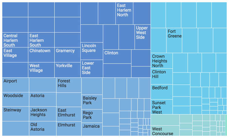 CDP Data Visualization enables you to create Treemap visuals. Treemaps display hierarchical data as a set of nested rectangles. Each 'branch' of the tree is a rectangle that corresponds to a particular dimension, with smaller rectangles that represent secondary dimensions. All rectangle areas are proportional to the aggregate measure that corresponds to the dimension.