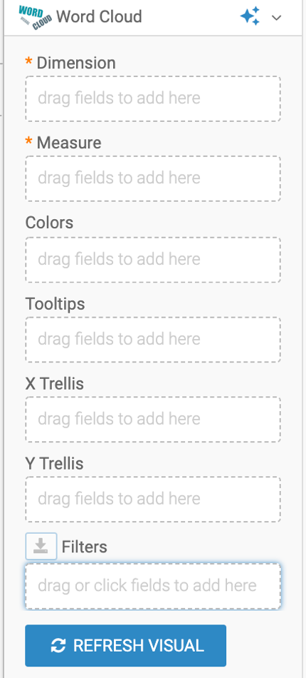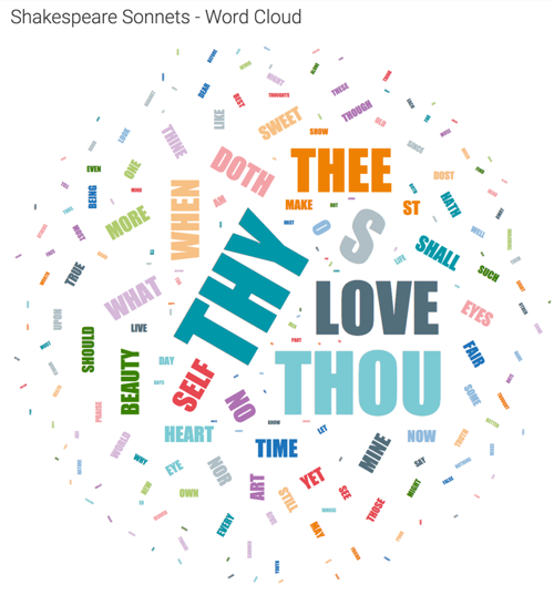 In the following example, the Shakespeare's Sonnets dataset is used. For an overview of shelves that specify this visual, see Shelves for word cloud visuals.