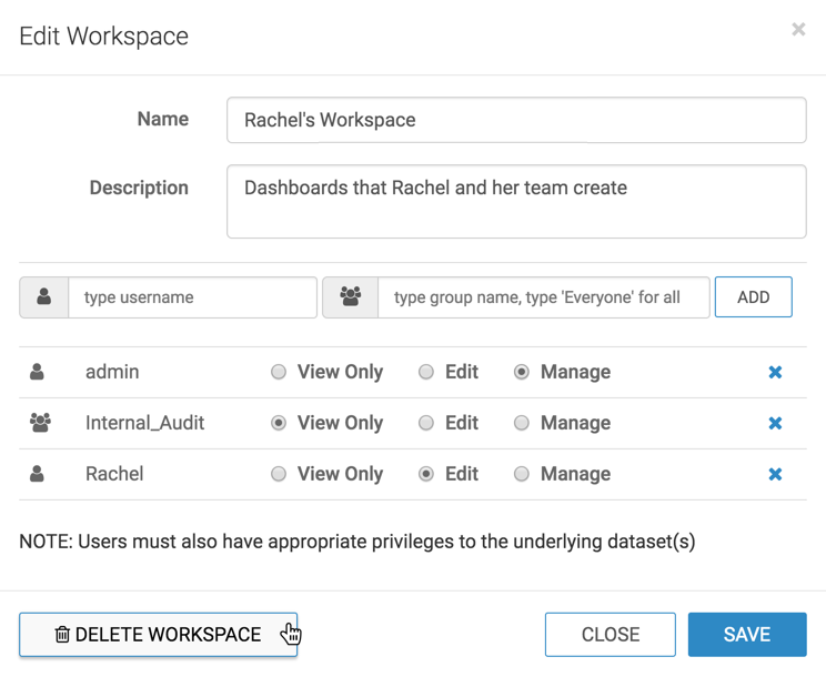 To delete workspaces, you must have Manage privilege for the workspace.