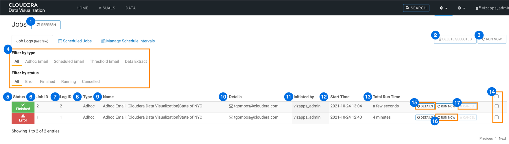 Here is a representative view of the Jobs Log page, its features, and the actions available to the user. By default, the Jobs interface opens on the Job Log tab, which provides information on all jobs.