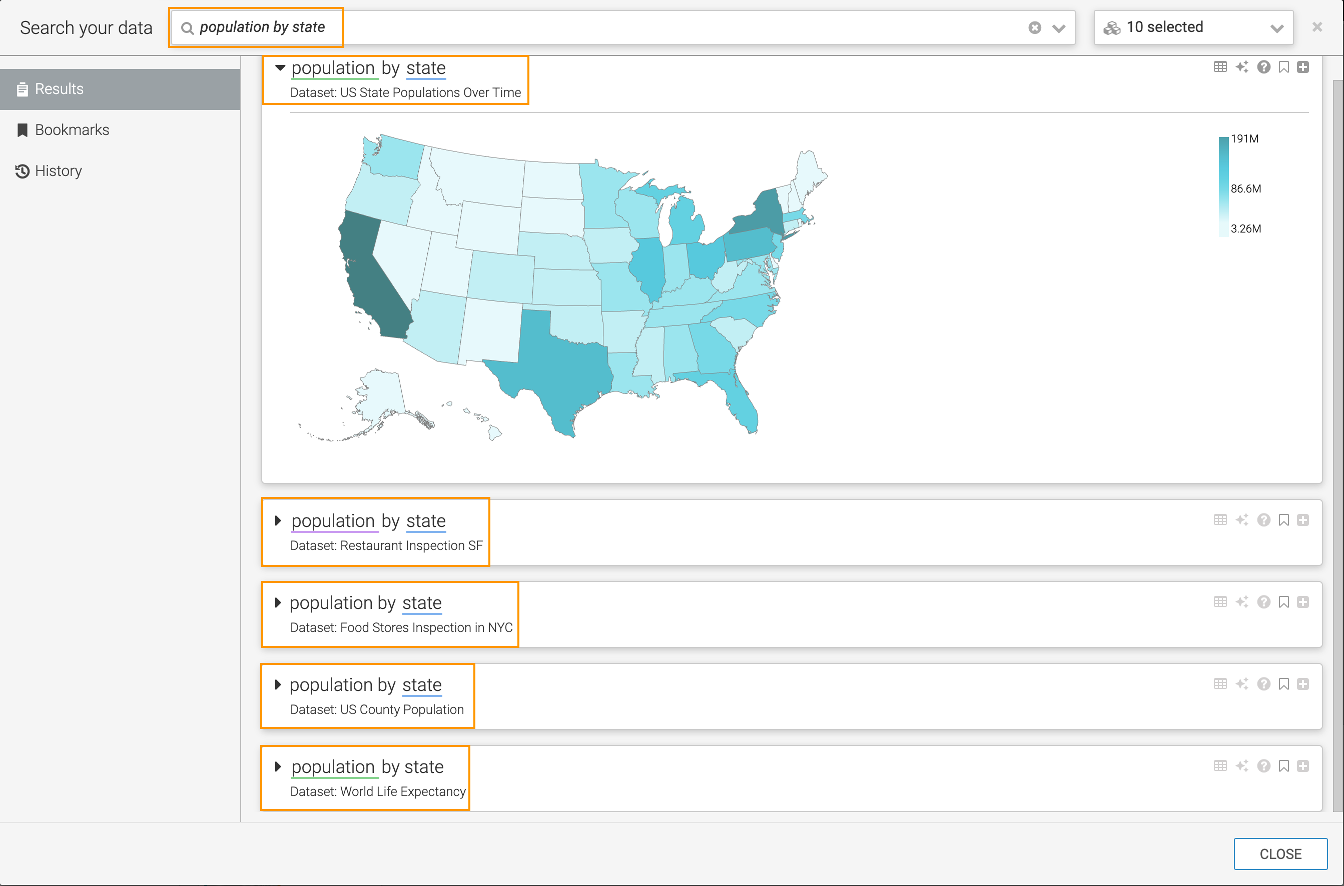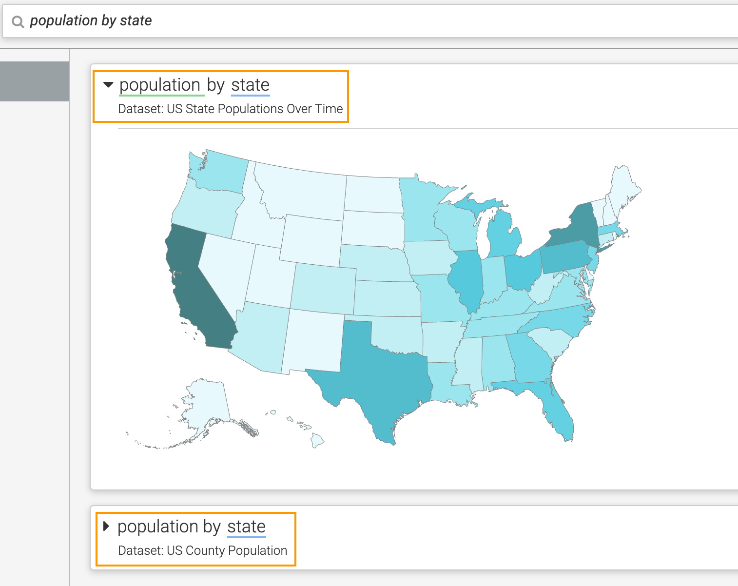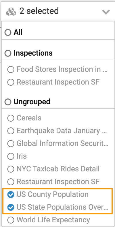 In the figure below, the US County Population and US State Populations Over Time datasets are selected, so the results based on the other datasets no longer appear in the search results.